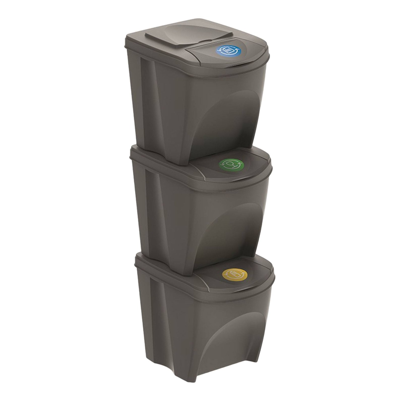 Set de 3 cubos de reciclaje en varios colores de 25 litros cada uno para papel, vidrio y plastico.